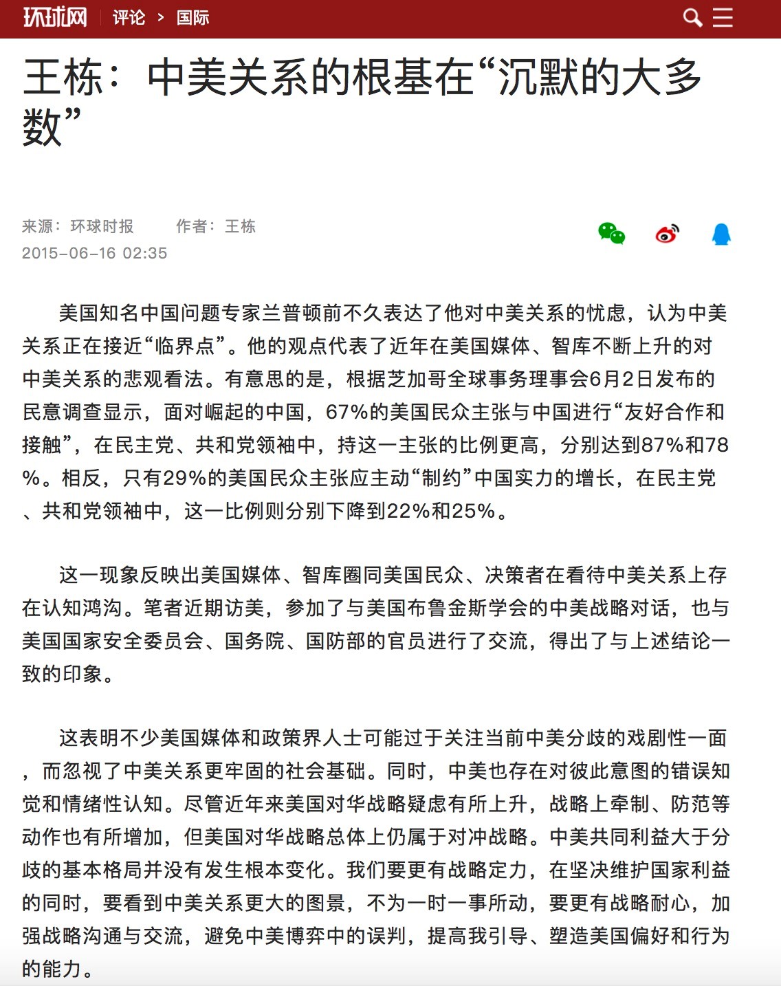 "The silent majority is the embodiment of the new model of major-country relationship between China and the United States. Their voices may not always make the front pages, but as observers of china-U.S. relations, we should never ignore them."