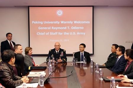 On the afternoon of February 21, 2014, General Raymond Odierno, Chief of Staff for the U. S. Army, visited Peking University. Wang Enge, President of Peking University, and Jia Qingguo, Dean of School of International Studies, met with guests in Central Hall of Lake House.President Wang Enge warmly welcomed General Odierno and briefed him on the exchanges between Peking University and American colleges and universities.General Odierno thanked President Wang for his warm reception and hoped to establish more contacts with Peking University on the basis of the visit.