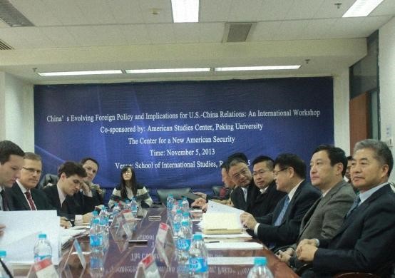 From 8: 30 a.m. to 12 a.m. on November 5, 2013, the international workshop on the “China’s Evolving Foreign Policy and Implications for U.S.-China Relations” was held in Room C105 of School of International Studies, Peking University, co-organized by American Studies Center, Peking University and Center for a New American Security, a famous think tank in the US. There were nearly 20 scholars both from Peking University, China Institute of International Studies, National Defense University, Academy of Military Sciences PLA China, and from the U.S., Sweden and Denmark participated in this seminar. Professor Wang Jisi, Dean of School of International Studies, Peking University and Dr. Patrick Cronin, Senior Director of Center for a New American Security, delivered speeches. In Professor Wang Jisi’s opinion, both domestic politics and international environment propel the evolution of China’s foreign policy; while Dr. Cronin believed that development of China-U.S. relations and the study on foreign policies are of vital importance given that every change to China’s foreign policy would draw the wide attention of the international community. Subsequently, the conference then engaged in deep communication and discussion on changes of China’s foreign policies and their influences on China-U.S. relations.