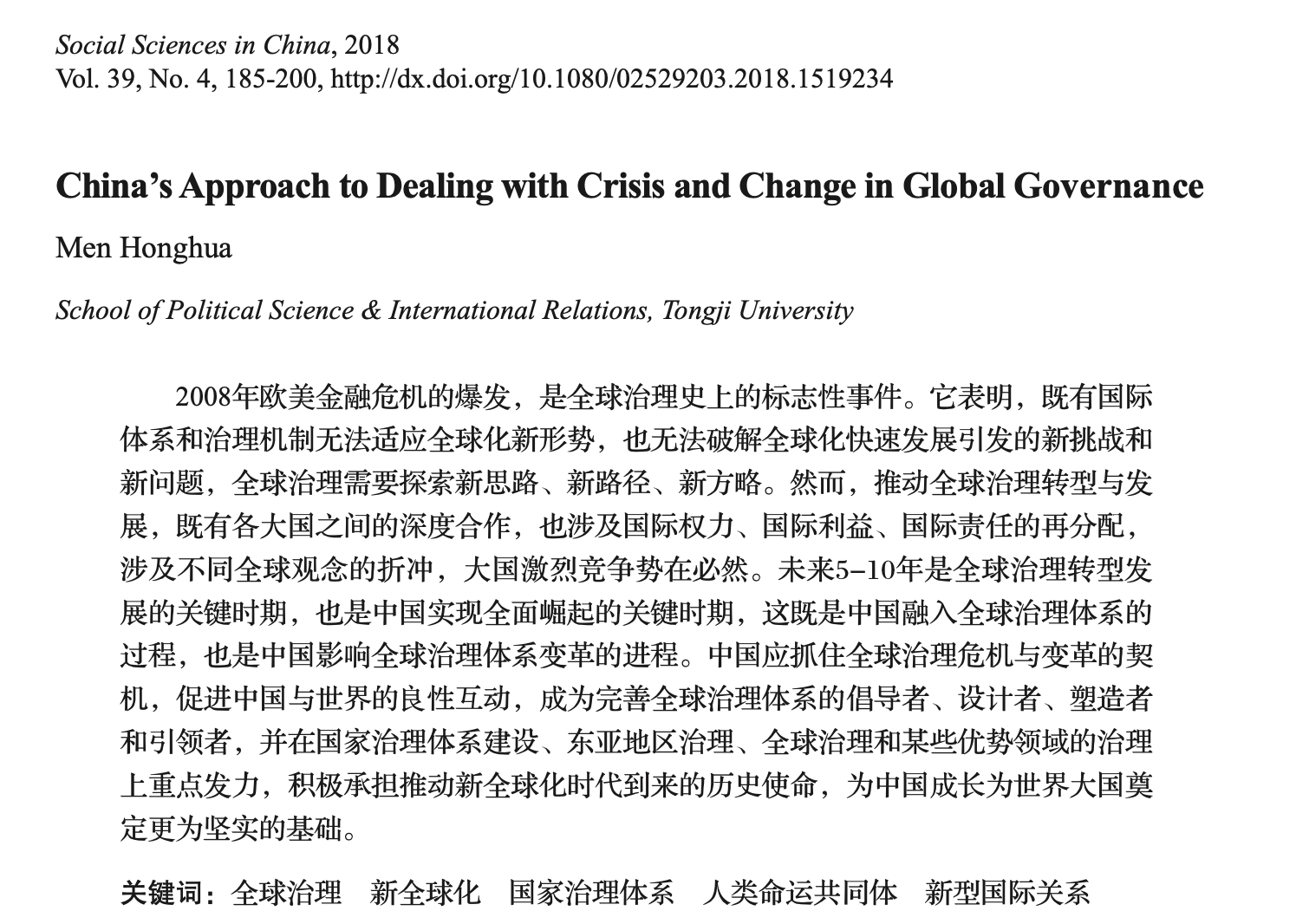 [Key words] global governance, new globalization, national governance system, community of shared future for mankind, new-type international relations