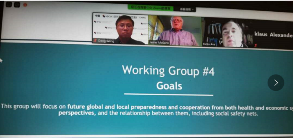 The COVID-19 pandemic, which is raging all over the world, is the common enemy of the international community. It not only threatens the health and safety of all mankind, but also brings unprecedented challenges for the economic development and social governance of countries all over the world. On the evening of May 13th, 2020, the second online seminar of the Global Town Hall Meeting was successfully held. The seminar was jointly sponsored by the Think Tanks and Civil Societies Program (TTCSP) of the University of Pennsylvania, an evaluation institute of world-famous think tanks, the annual ranking report Global Go To Think Tank Index published by TTCSP is one of the most influential and authoritative think tanks in the world, and 78 well-known think tanks around the world, forming the Think Tank Planning Committee. Members of the Planning Committee include leading U.S. think tanks such as the Brookings Institution, Heritage Foundation, Center for Strategic and International Studies, RAND Corporations, Hudson Institute, Atlantic Council, Peterson Institute for International Economics, Wilson International Centre for Scholars, Stimson Center, Center for American Progress and Center for New American Security, Russian International Affairs Council (RIAC), Royal Institute of International Affairs of the United Kingdom, Institute of Montaigne of France, Konrad-Adenauer-Stiftung (KAS) of Germany, Italian Institute for International Political Studies (ISPI), Center for International Governance Innovation (CIGI) of Canada, Japan Institute of International Affairs (JIIA), Norwegian Institute of International Affairs, Sejong Institute of South Korea, Observer Research Foundation (ORF) of India, African Center for the Constructive Resolution of Disputes (ACCORD), Vargas Foundation of Brazil, Center for Strategic and International Studies of Indonesia, Singapore Institute of International Affairs (SIIA), as well as the Institute for Global Cooperation and Understanding (iGCU) at Peking University, China. As one of the co-sponsors, iGCU was invited to participate in the work of the Planning Committee and the seminar, holding full discussions with 440 think tanks' senior executives and scholars from 85 countries and regions across all continents on the current global situation of fighting the pandemic, economic and social issues, and international cooperation. The seminar was chaired by Dr. James McGann, Director of the TTCSP. Wang Dong, Executive Director of the iGCU at Peking University, joined John Allen, President of the Brookings Institution, Kay Coles James, President of the Heritage Foundation, and other 20 senior think tank executives to speak at 5 working groups.
