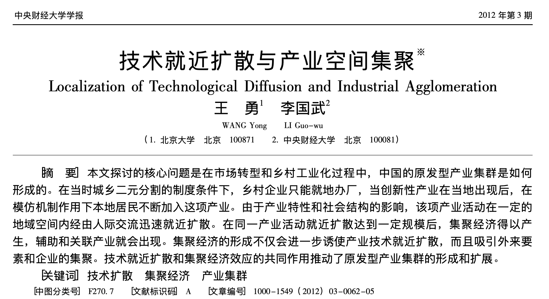 [Key words] Technological diffusion; Agglomeration economy; Industrial clusters